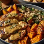 Eine herzliche Bowl mit saftigem Hühnchen, karamellisierten Süßkartoffeln und nahrhafter Quinoa, perfekt für ein wohltuendes Essen.