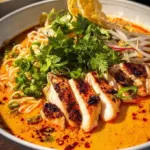Ein cremiges Ramen-Gericht mit zartem Hähnchen, aromatischen Gewürzen und frischen Zutaten, ideal für einen romantischen Abend.