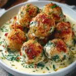 Gebackene Hähnchen-Ricotta-Fleischbällchen mit Spinat-Alfredo-Glück verkörpern die warme Umarmung eines liebevoll zubereiteten Abendessens. Der Moment, wenn die ofenfrischen Fleischbällchen Ihre Küche mit einem köstlichen Aroma durchdringen, ist unvergleichlich. Stellen Sie sich den ersten Biss vor – die knackige, goldbraune Außenschicht knackt leicht, während sich das zarte Hähnchenfleisch mit dem cremigen Ricotta und den herzhaften Aromen von Knoblauch und Zwiebel vereint. Geschmolzener Parmesan verirrt sich auf Ihrem Gaumen und hinterlässt einen reichhaltigen, zufriedenen Nachgeschmack. Und während sich die Spinat-Alfredo-Sauce über den Fleischbällchen verteilt, macht sich die cremige Textur auf den Lippen bemerkbar – ein wahres Fest der Sinne!