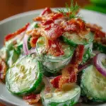 Ein erfrischender Gurkensalat mit knusprigem Speck und cremigem Dressing, perfekt für Grillabende oder als leichtes Mittagessen.