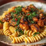 Eine köstliche Pasta mit saftigen Hähnchenstücken, süßem Honig und scharfer Soße, perfekt für jedes Dinner.