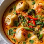 Eine cremige und aromatische Kokos-Curry-Suppe mit herzhaften Knödeln, die Wärme und Freude in dein Zuhause bringt.