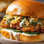 - Stellen Sie die Sandwiches zusammen: Legen Sie ein knuspriges Hähnchenbrustfilet auf ein Brötchen, garnieren Sie es mit der Koriander-Limetten-Sauce und dem Gurken-Slaw. Servieren Sie es warm für das beste Erlebnis.