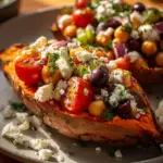Diese gefüllten Süßkartoffeln sind nicht nur eine weitere vegetarische Option; sie sind eine köstliche Entdeckung, die an jedem Tisch für Gesprächsstoff sorgt. Sie kombinieren den süßen, erdigen Geschmack von Süßkartoffeln mit einer Vielzahl an frischen mediterranen Zutaten, die den Gaumen erfreuen. Wenn Sie auf der Suche nach einem gesunden, befriedigenden Gericht sind, eignet sich dieses Rezept perfekt für ein Abendessen unter der Woche, ein entspanntes Beisammensein mit Freunden oder sogar für ein festliches Anlassessen.