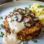 Ein köstliches Gericht aus goldbraun gebratenen Rösti mit geschmolzenem Mozzarella und einer cremigen Pilzsauce, perfekt für besondere Anlässe oder als gemütliches Essen.
