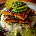 Zum Zusammenstellen des Turms legen Sie die geschnittenen Hähnchenstücke auf einen Bett aus gekochtem Reis, garnieren mit Avocadoscheiben und frisch gehacktem Koriander. Servieren Sie alles mit Limettenkeilen für zusätzlichen köstlichen Spritz!