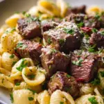 Saftige Steakstückchen kombiniert mit Muschelpasta in einer reichhaltigen Knoblauchbutter-Alfredo-Sauce, ideal für besondere Anlässe.