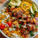 Eine farbenfrohe und leckere Bowl mit gegrilltem Hühnchen, gebratenem Straßenmais und frischen Zutaten für ein gesundes Mittag- oder Abendessen.