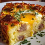 Ein köstlicher Auflauf aus Wurst, Eiern und Frischkäse, kombiniert mit knusprigen Kartoffelrösti für ein herzhaftes und nahrhaftes Gericht.